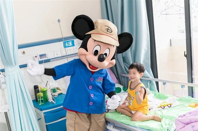 ▲“卡通人偶”医生在三亚市妇幼保健院病房与小患者互动