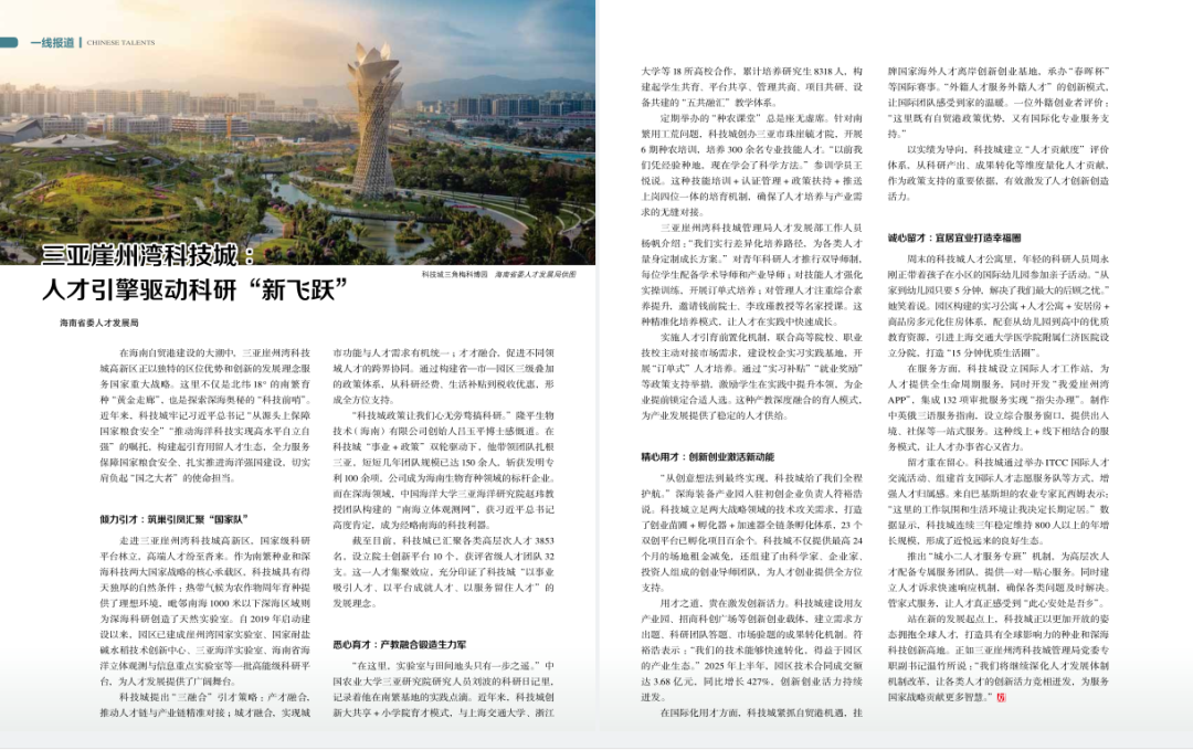 在海南自贸港建设的大潮中,三亚崖州湾科技城高新区正以独特的区位优势和创新的发展理念服务国家重大战略。这里不仅是北纬18°的南繁育种“黄金走廊”,也是探索深海奥秘的“科技前哨”。近年来,科技城牢记习近平总书记“从源头上保障国家粮食安全”“推动海洋科技实现高水平自立自强”的嘱托,构建起引育用留人才生态,全力服务保障国家粮食安全、扎实推进海洋强国建设,切实肩负起“国之大者”的使命担当。