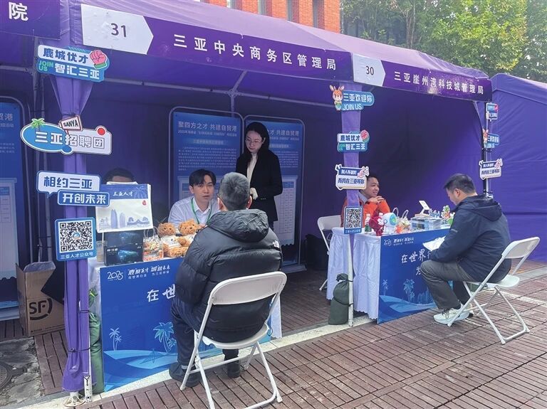 值得一提的是,各展区以特色布展传递满满诚意:政策介绍清晰解读人才扶持举措,椰子形状的毛绒玩偶、精美贝壳等三亚主题装饰堆头营造浓郁地域风情,宣传手册、岗位手册系统呈现发展优势,更贴心准备人才礼遇伴手礼,从视觉到服务全方位打造“三亚记忆点”,为用人单位引才揽才赋能。参加招聘的三亚企事业单位携核心岗位集中亮相,热门企业展位前早早排起长队,学子们手持简历,围绕岗位需求、职业前景、薪资待遇等问题与招聘负责人深入交流,现场供需对接氛围热烈。
