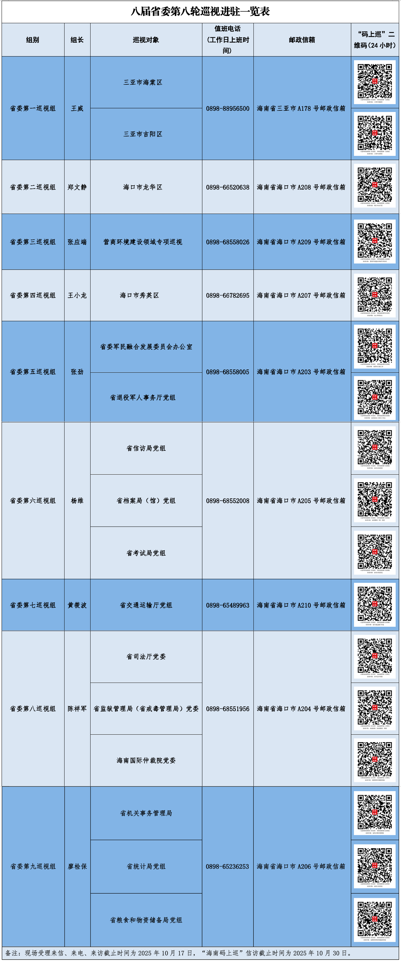 据悉,本轮巡视为期3个月,期间9个省委巡视组均设立专门值班电话、邮政信箱,并公布“海南码上巡”微信二维码,主要受理反映被巡视党组织领导班子及其成员、下一级党组织主要负责人和重要岗位领导干部问题的来信来电来访,重点是关于违反“六大纪律”以及巡视整改等方面的举报和反映。对其他与巡视工作无直接关系的个人诉求、涉法涉诉等信访问题,将按照分级负责、属地管理原则,转交有关单位办理。巡视组现场受理群众来信、来电、来访时间截止到2025年10月17日,“海南码巡”信访截止时间为2025年10月30日。